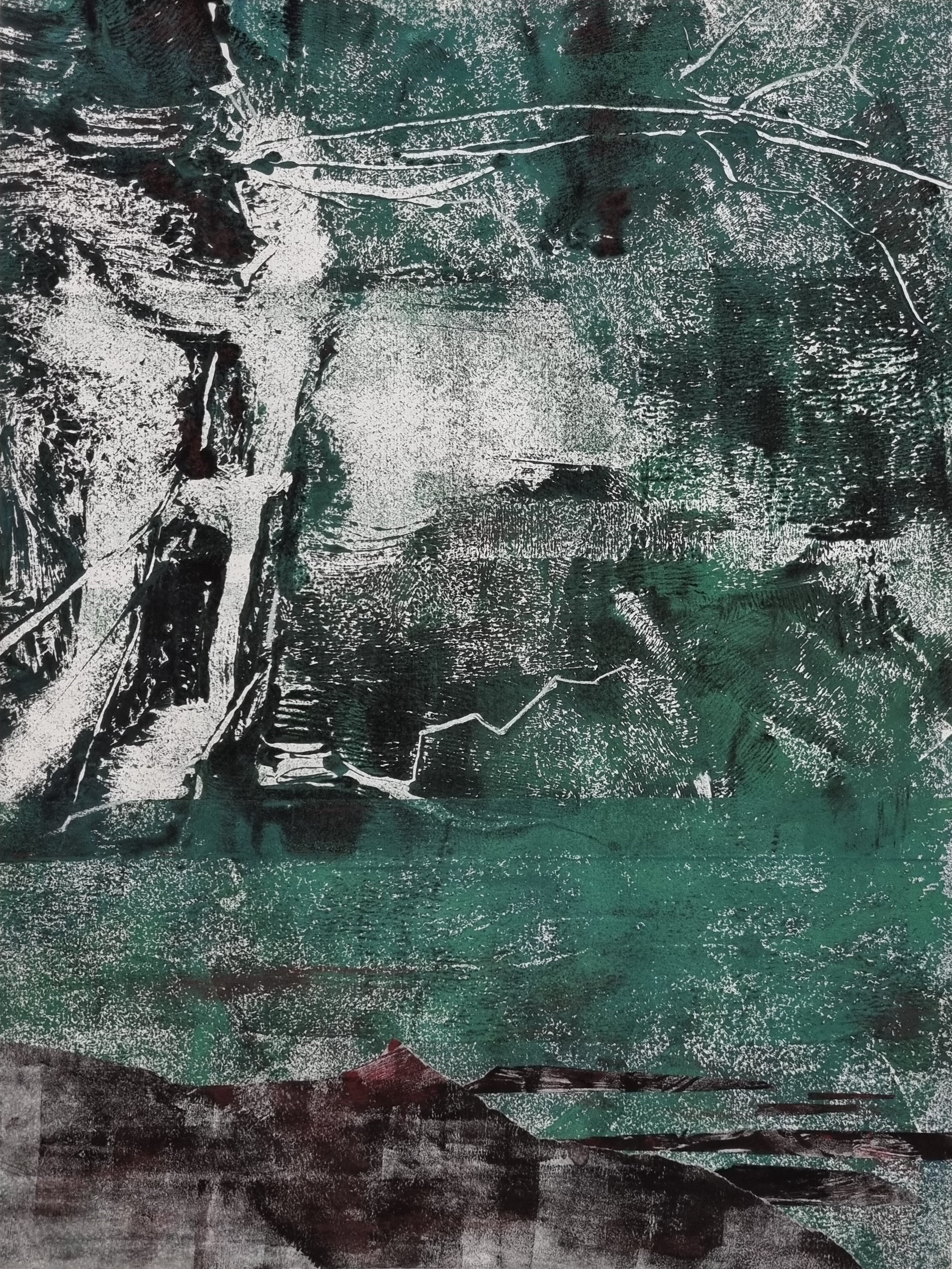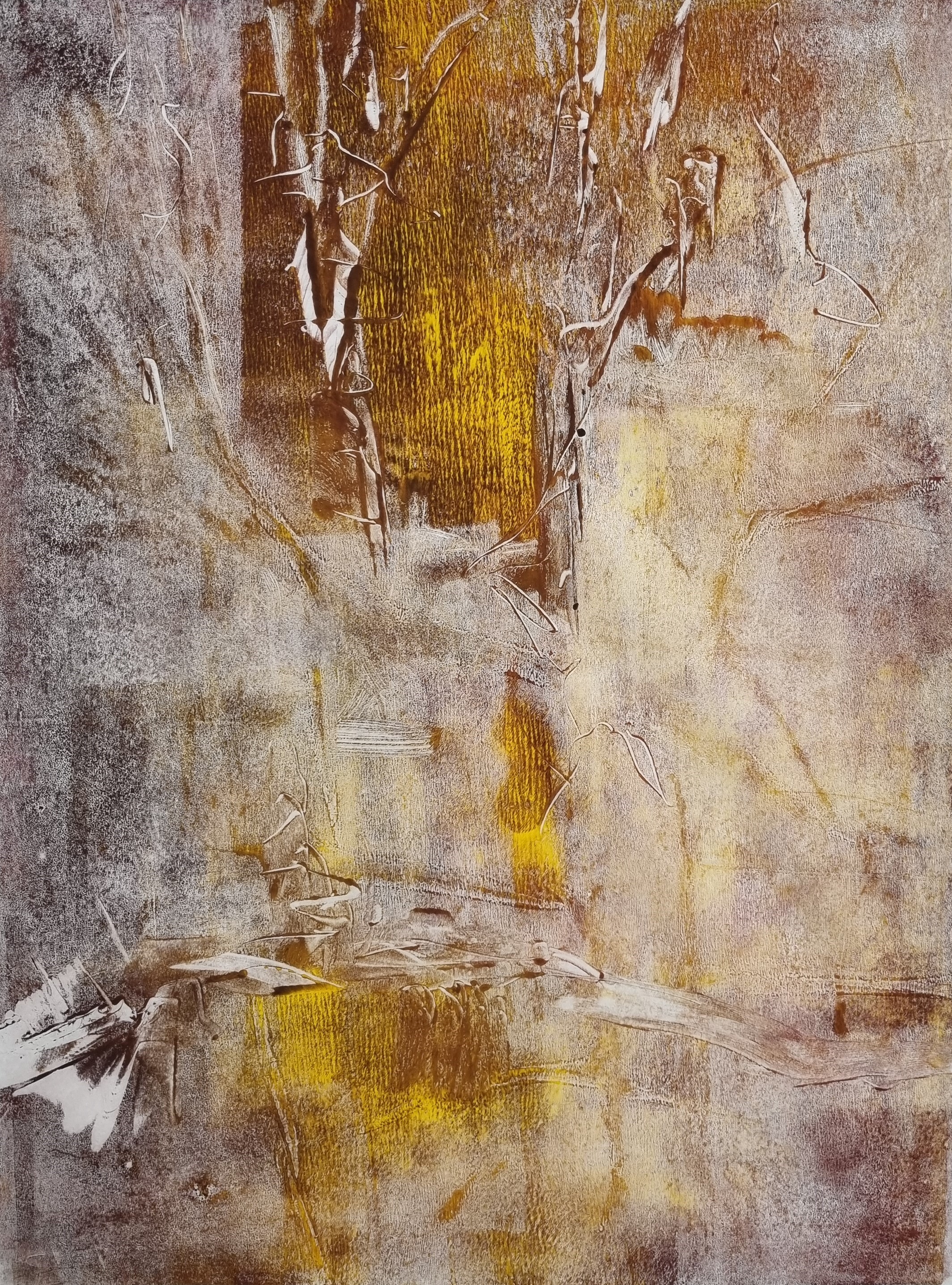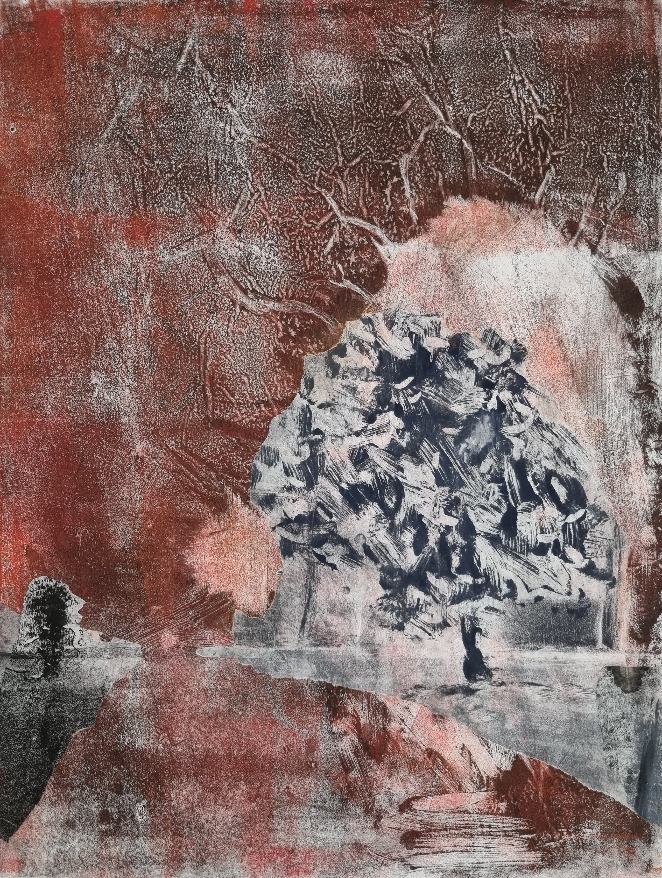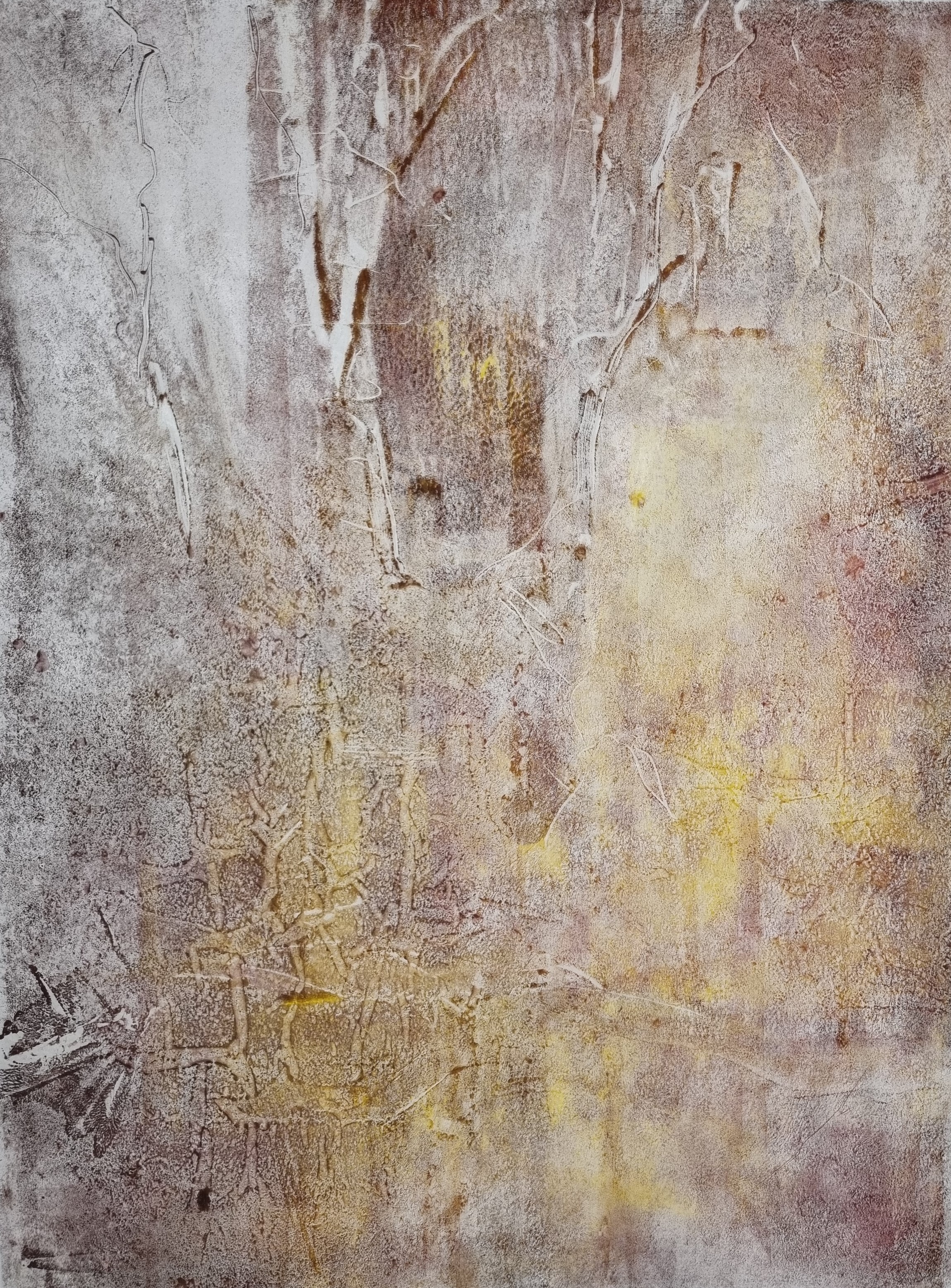 Im Rahmen meiner Abschlussarbeit habe ich die collagierte Monotypie für mich entdeckt und weiterentwickelt. Eine spezielle Technik, die aus Malerei, Druck und Collage besteht. Ich verwende nur spezielles Seidenpapier, was das Bild besonders filigran, zart und vergänglich erscheinen lässt. Mir gefällt besonders, dass ich trotz Konzept und gezieltem Arbeiten an einem Thema durch diese Technik immer wieder überrascht werde und darauf weiter aufbauend arbeiten kann. Durch den bewussten Verlust der Kontrolle und die teilweise nötigen schnellen Entscheidungen im Bild bin ich immer im Dialog mit dem Werk und schlussendlich mit mir selber.