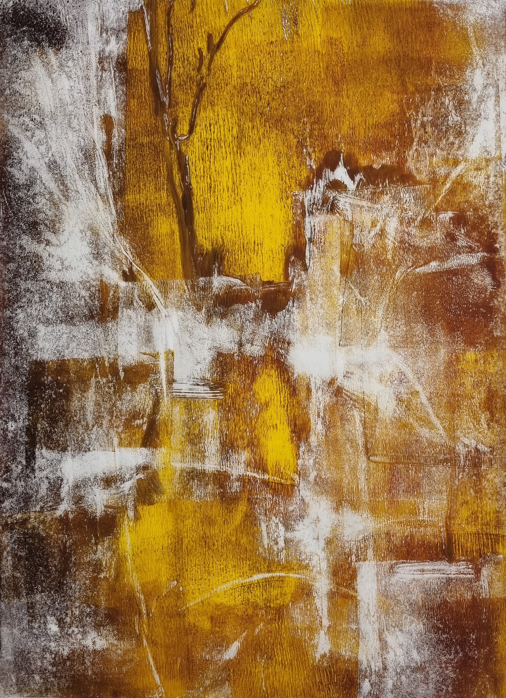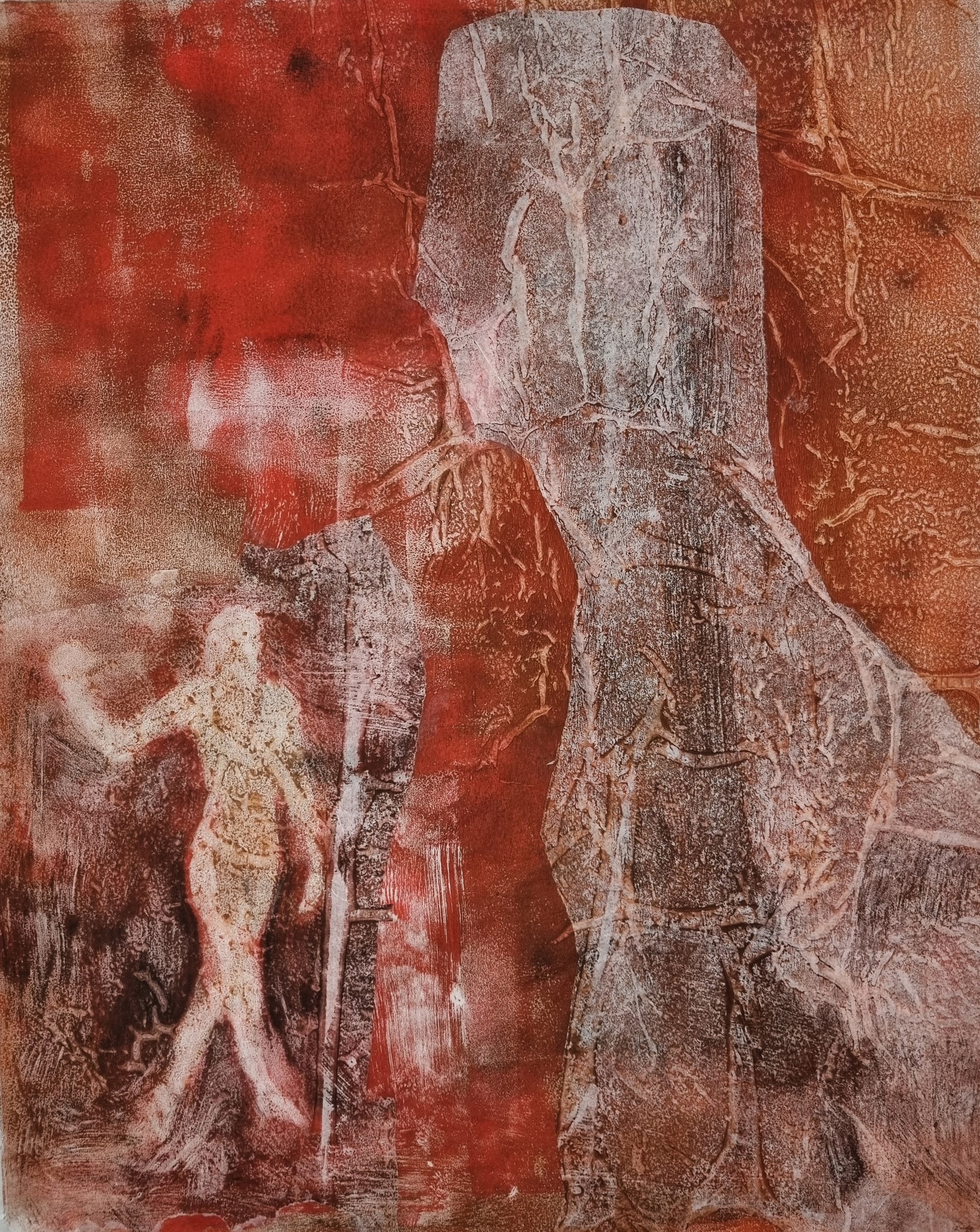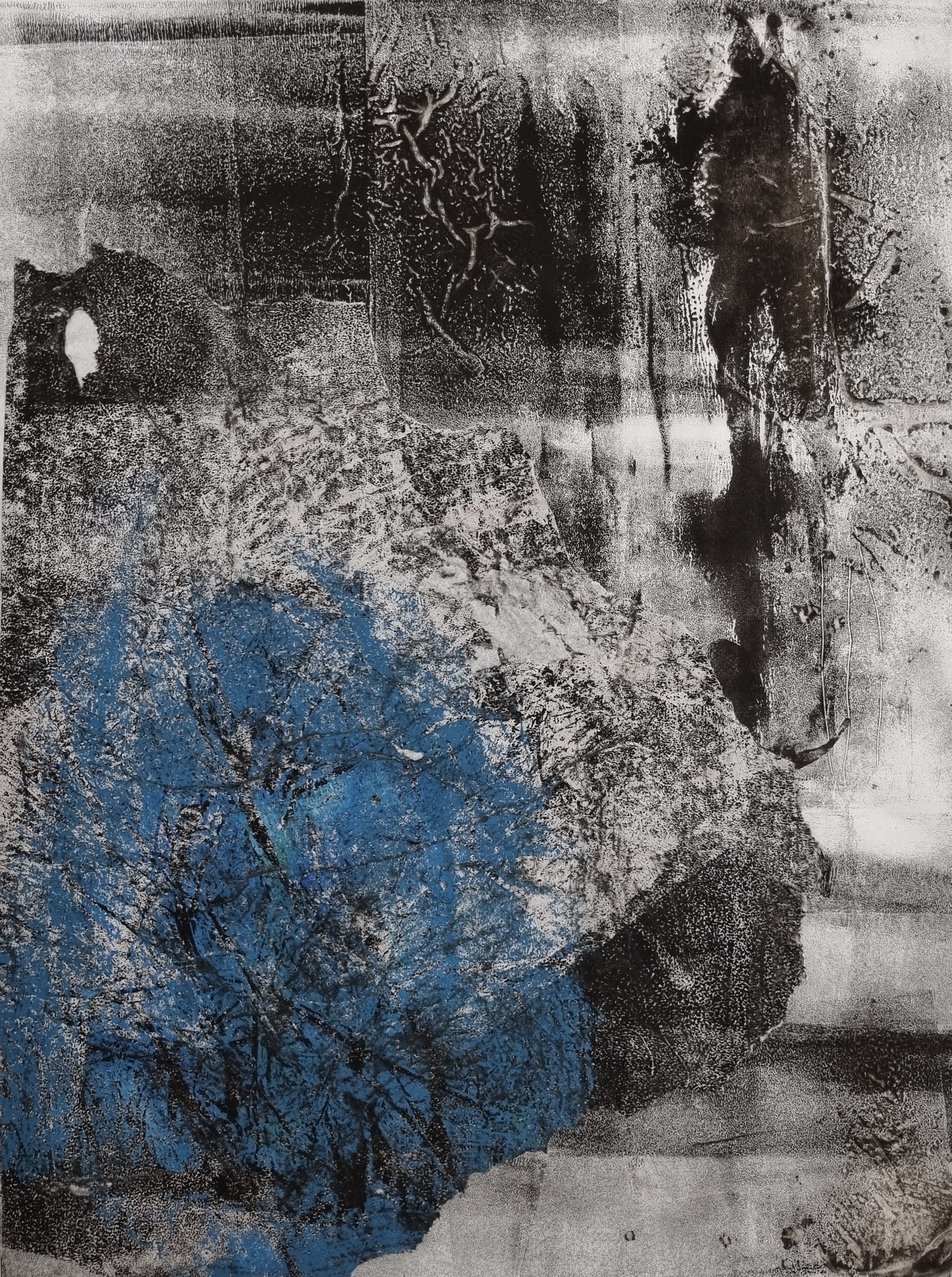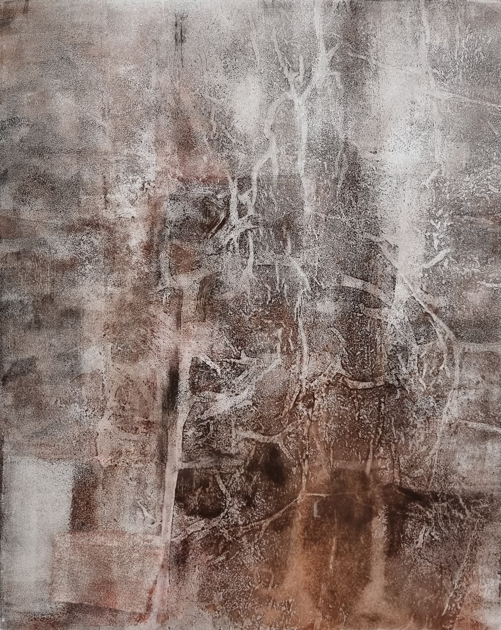 Im Rahmen meiner Abschlussarbeit habe ich die collagierte Monotypie für mich entdeckt und weiterentwickelt. Eine spezielle Technik, die aus Malerei, Druck und Collage besteht. Ich verwende nur spezielles Seidenpapier, was das Bild besonders filigran, zart und vergänglich erscheinen lässt. Mir gefällt besonders, dass ich trotz Konzept und gezieltem Arbeiten an einem Thema durch diese Technik immer wieder überrascht werde und darauf weiter aufbauend arbeiten kann. Durch den bewussten Verlust der Kontrolle und die teilweise nötigen schnellen Entscheidungen im Bild bin ich immer im Dialog mit dem Werk und schlussendlich mit mir selber.